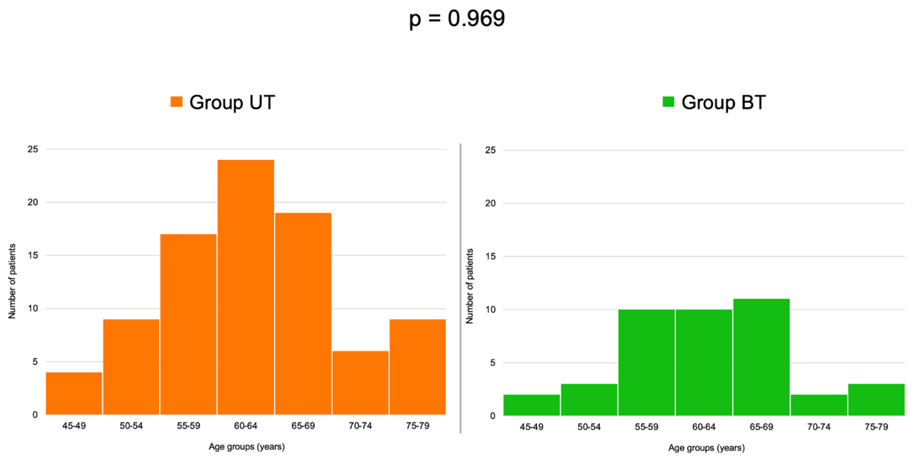 | Age Group (years) | UT Group (N = 88, 68.22%)) | BT Group (N = 41, 31.78%) | p-Value |