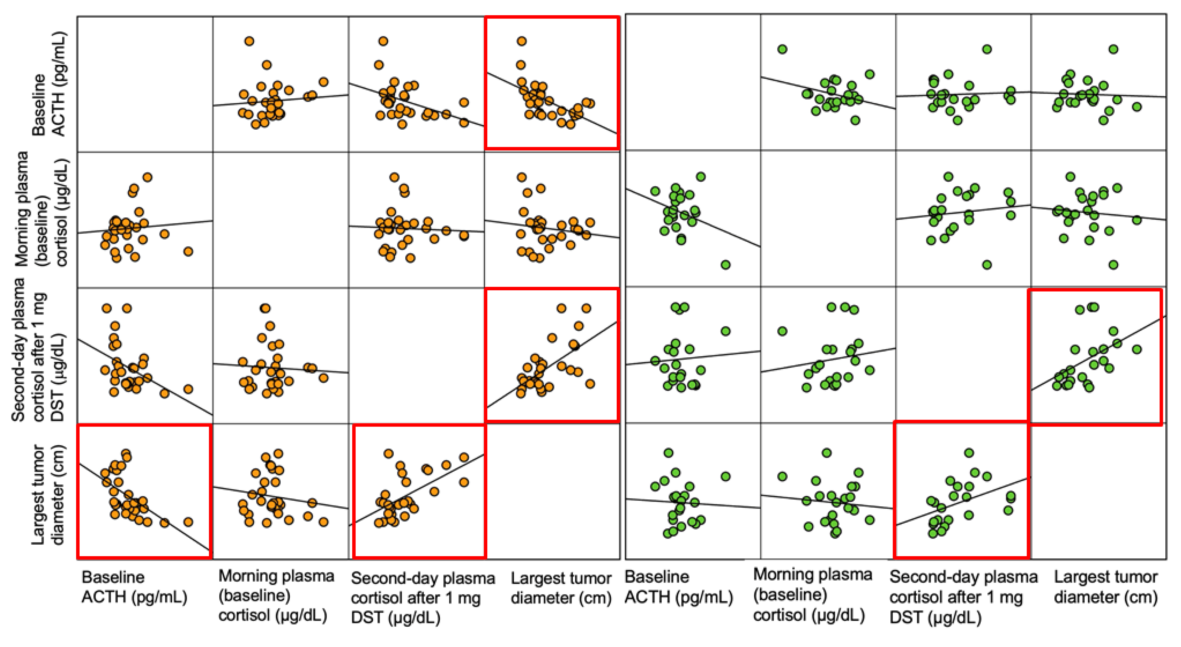 | Second-day plasma cortisol after 1 mg DST (μg/dL) | p = 0.089 r = −0.215 | p = 0.973 r = −0.004 | p < 0.001 r = 0.306 | p = 0.320 r = 0.131 | p = 0.655 r = 0.065 | p = 0.309 r = 0.149 | p = 0.591 r = −0.077 | p = 0.224 r = −0.213 | p = 0.107 r = −0.290 | p = 0.690 r = −0.058 | p = 0.401 r = 0.148 | p = 0.455 r = −0.136 | |