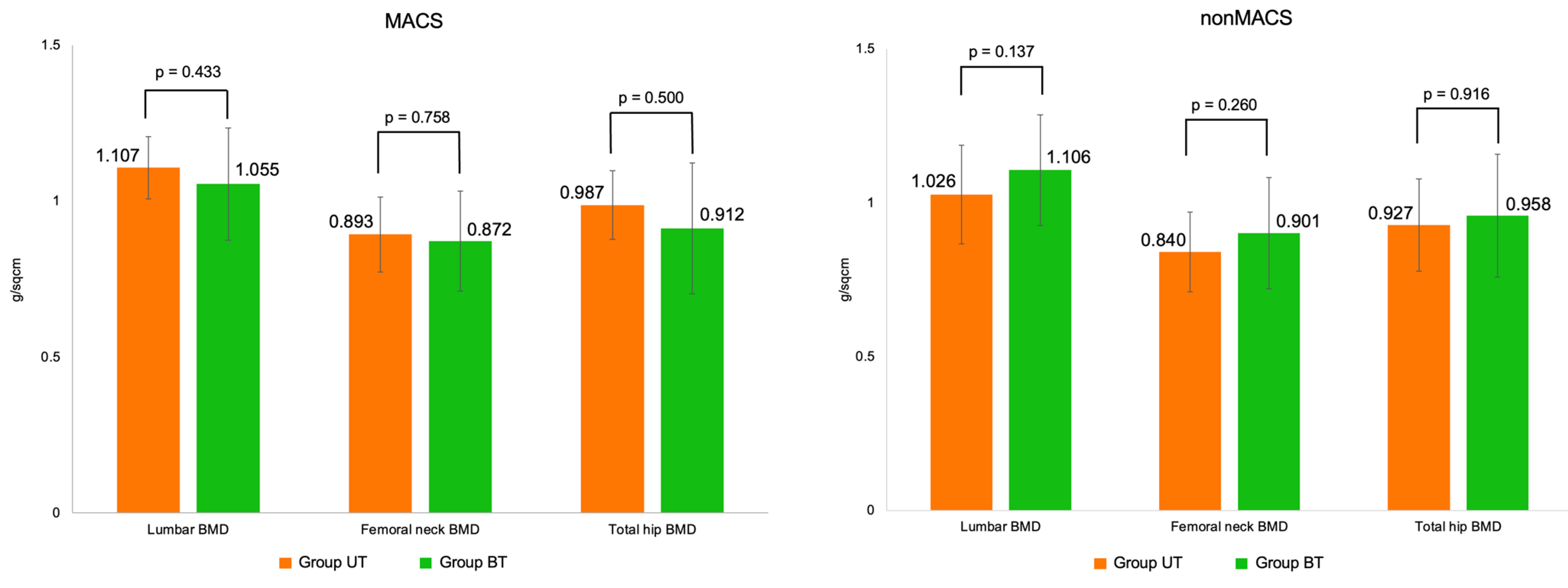 | Total hip BMD (g/sqcm), mean ± SD | 0.987 ± 0.11 | 0.912 ± 0.21 | 0.500 | 0.927 ± 0.15 | 0.958 ± 0.20 | 0.604 |
