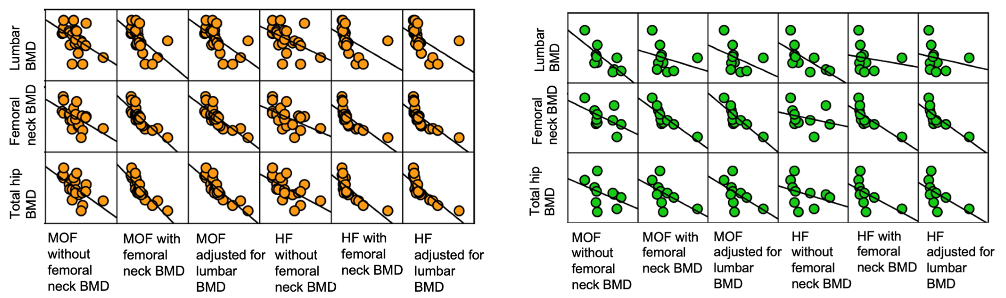 | Parameter | MOF Without Femoral Neck BMD | MOF with Femoral Neck BMD | MOF Adjusted for Lumbar BMD | HF Without Femoral Neck BMD | HF with Femoral Neck BMD | HF Adjusted for Lumbar BMD |