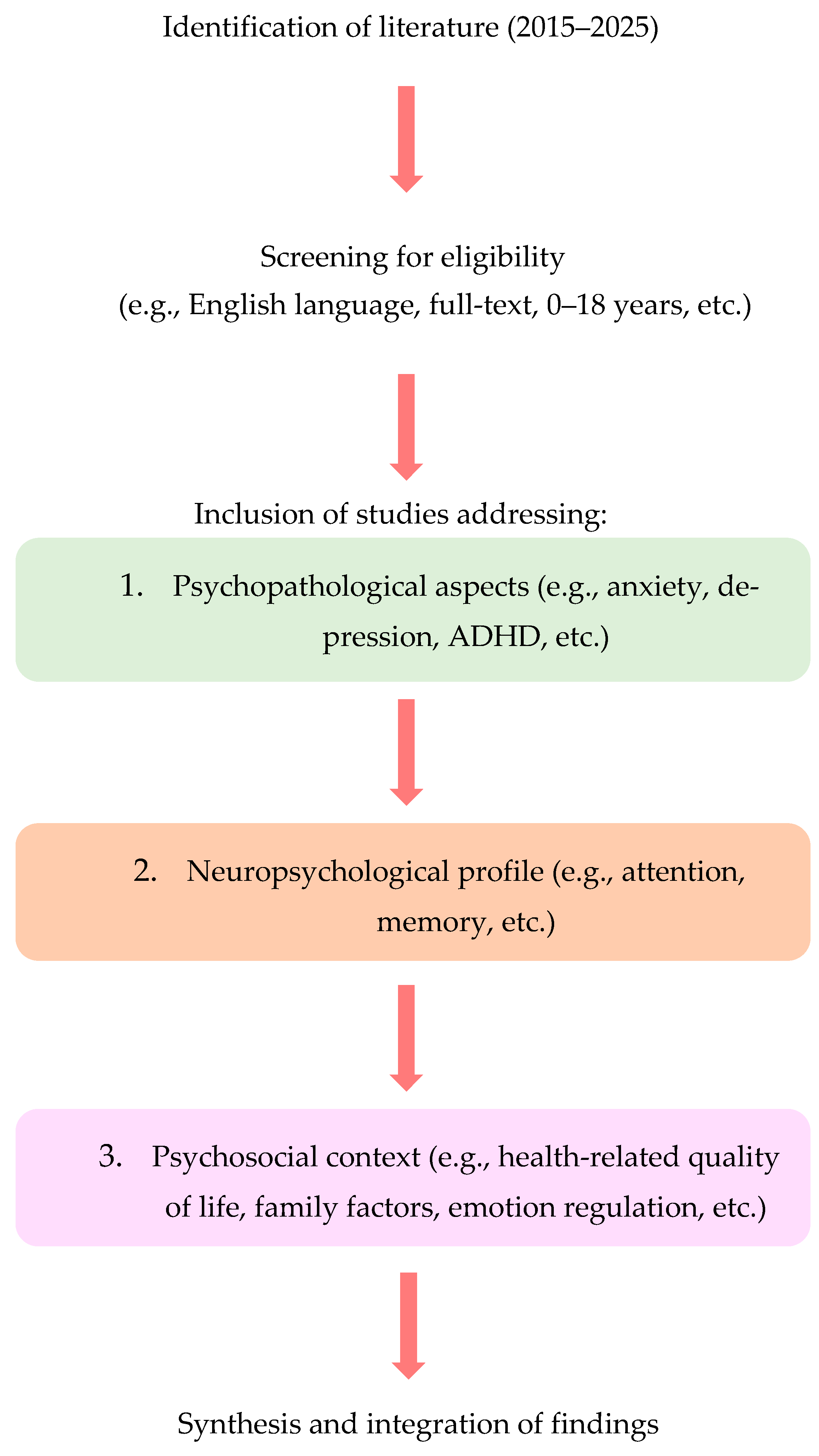 - Outcomes: At least one psychopathological outcome (e.g., anxiety, depression, ADHD, conduct problems) and/or neuropsychological functioning (e.g., attention, memory, executive functions), including emotional/behavioral profiles.