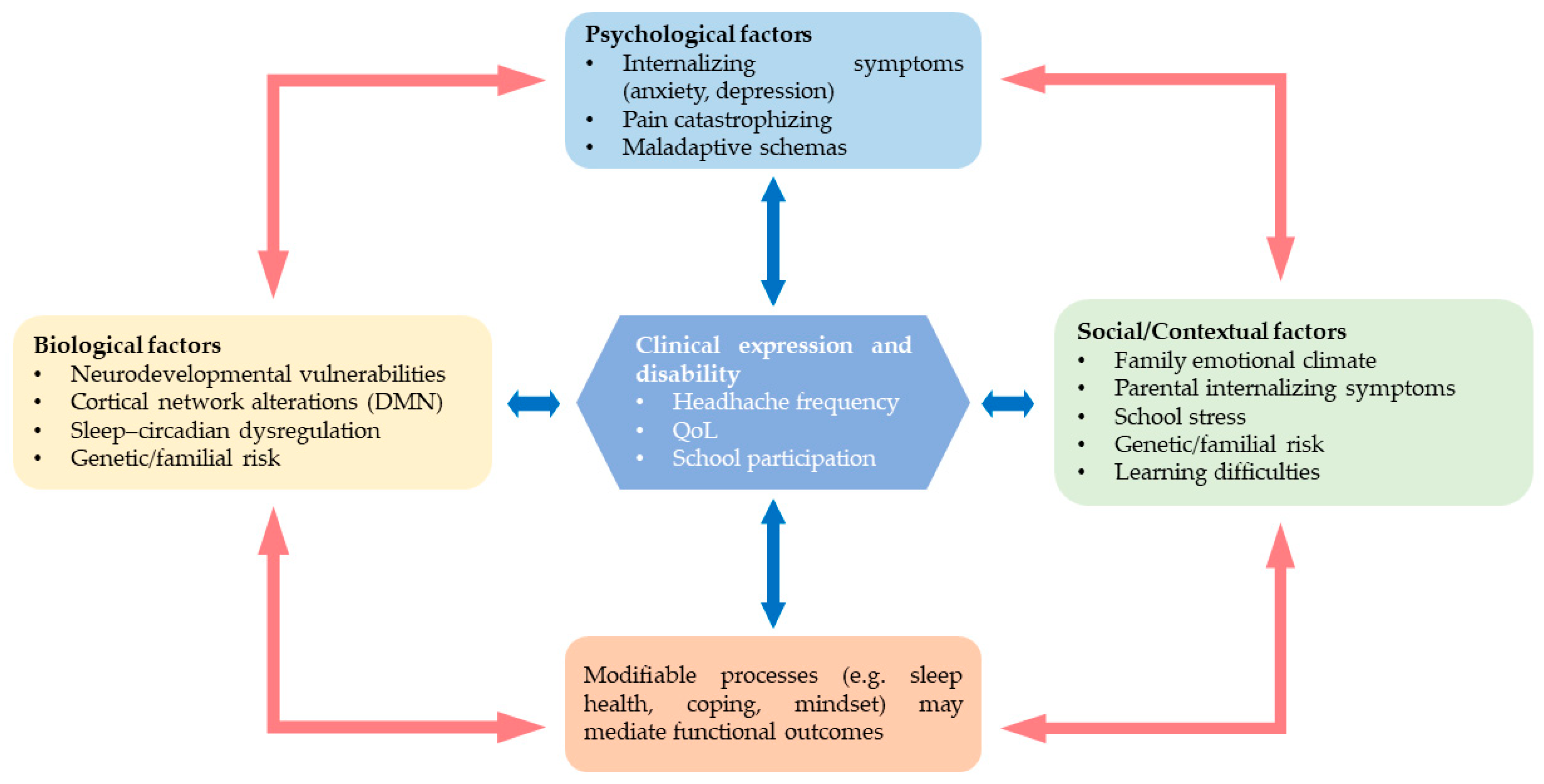 - Galli, F.; Caputi, M.; Gallucci, M.; Termine, C.; Chiappedi, M.; Balottin, U. Headache and Psychological Disorders in Children and Adolescents: A Cross-Generational Study. Minerva Pediatr. 2017, 69, 231–238. [Google Scholar] [CrossRef]