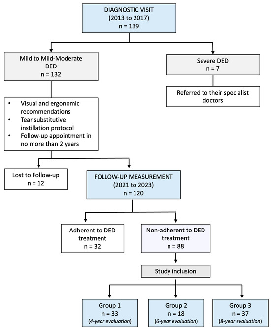 Background: The purpose of this study was to assess differences in clinical symptoms and signs of DED in non-adherent to treatment patients to describe long-term disease progression. Methods: 120 patients previously diagnosed with Dry Eye Disease (DED) were contacted to undergo a second eye examination. The final included participants were classified into three groups based on when the second examination was scheduled: 4 years (Group 1;