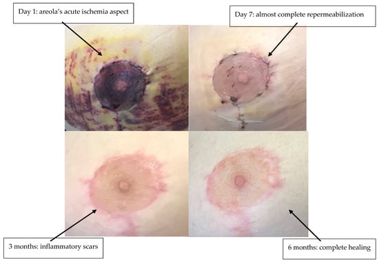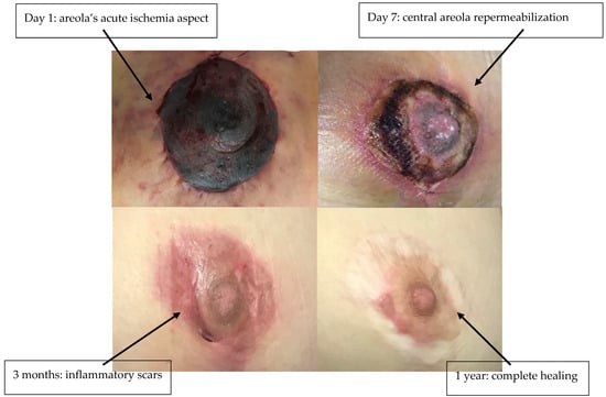 - Reichert, R.; Weitgasser, L.; Schoeller, T.; Wimmer, F.; Russe, E.; Mahrhofer, M. Compromised Nipple-Areola Complex Perfusion after Reduction Mammaplasty or Mastopexy: A Retrospective Evaluation of Different Treatments. Aesthetic Plast. Surg. 2025, 49, 3425–3432. [Google Scholar] [CrossRef]
