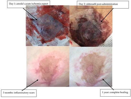 Our data suggest the potentially beneficial off-label use of sildenafil citrate in managing periareolar distress occurring after reduction mammoplasty, in relation to enhancing vascular perfusion and promoting physiological responses in breast tissue. The administration of sildenafil 20 mg 4 times daily led to the rescue of three necrotic NAC plaques, with only one of them also needing scarification with local heparin therapy, without any notable side effects. A uniform postoperative regimen—soft-silicone foam dressings, acetaminophen analgesia, and a 7-day amoxicillin–clavulanate course—may have modulated perfusion, infection risk, and comfort, potentially interacting with and contributing to the observed efficacy of sildenafil. Also, we acknowledge that bedside clinical evaluation without an NAC-specific validated device represents a study limitation. Given the small, single-center retrospective series without a control group and with short follow-up, our results are hypothesis-generating only and require confirmation in adequately powered, prospective randomized trials with standardized protocols and objective perfusion endpoints.