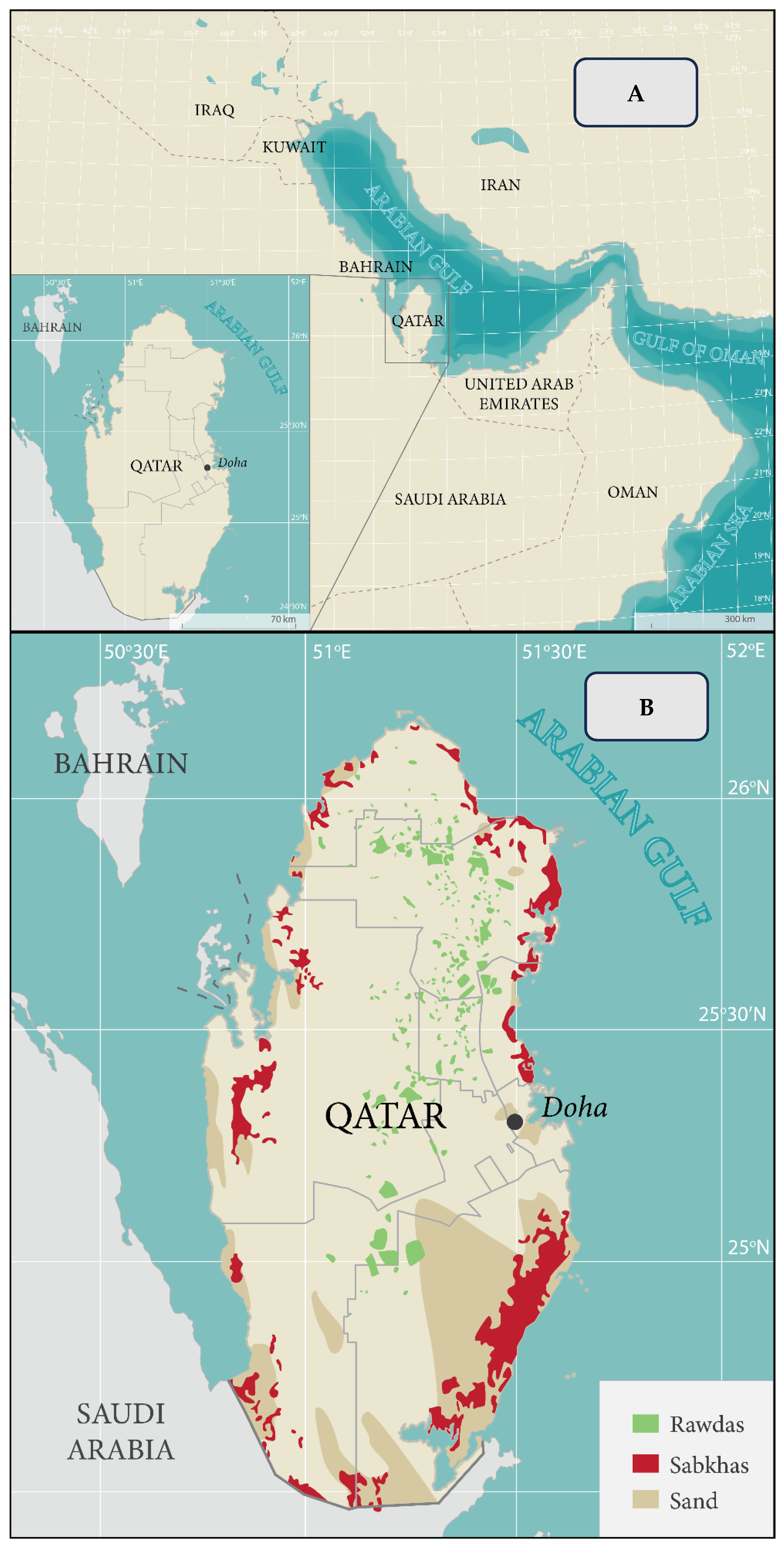 - Abdel-Bari, E.M.; Yasseen, B.T.; Al-Thani, R.F. Halophytes in the State of Qatar; Environmental Studies Center, University of Qatar: Doha, Qatar, 2007. [Google Scholar]