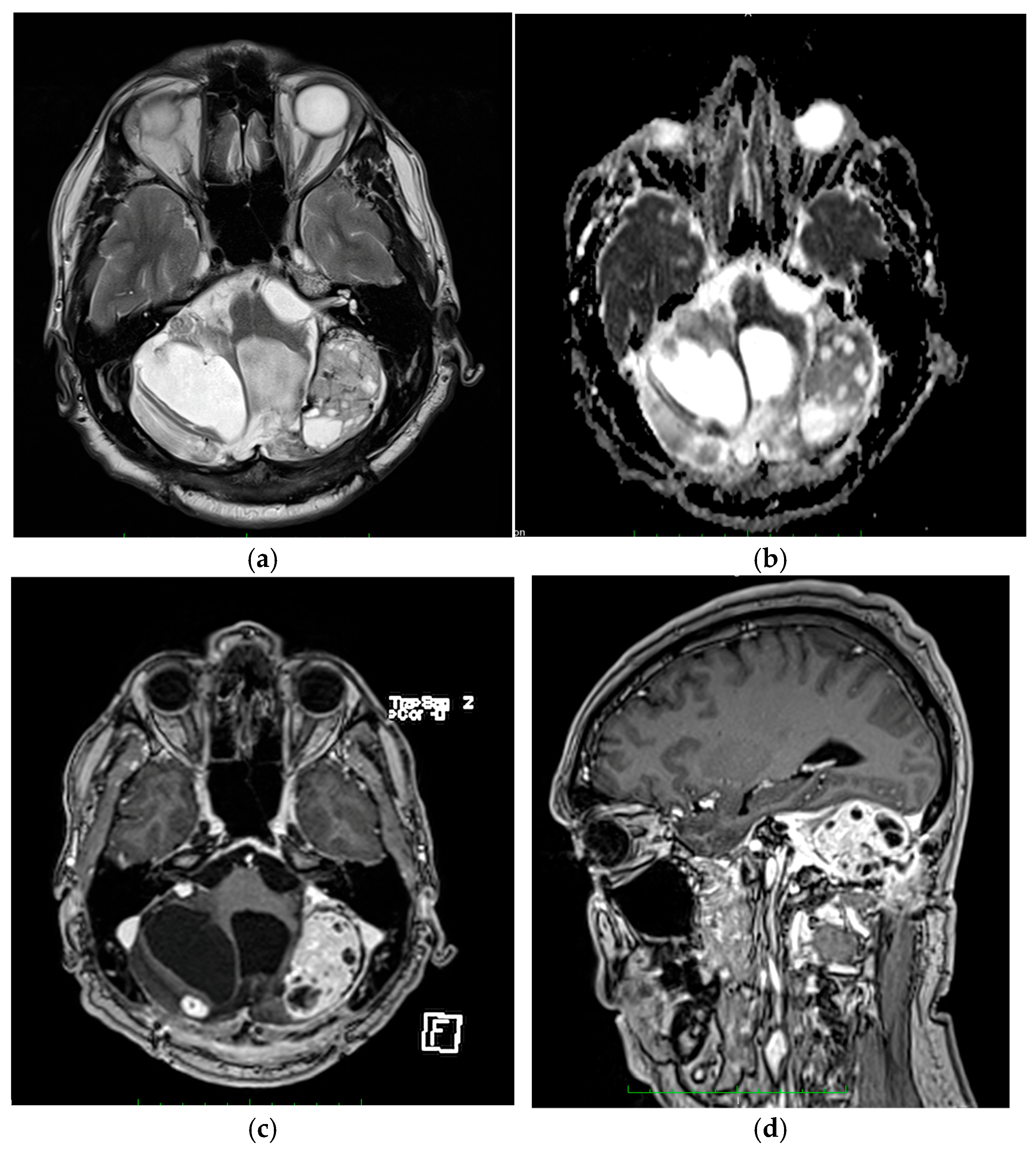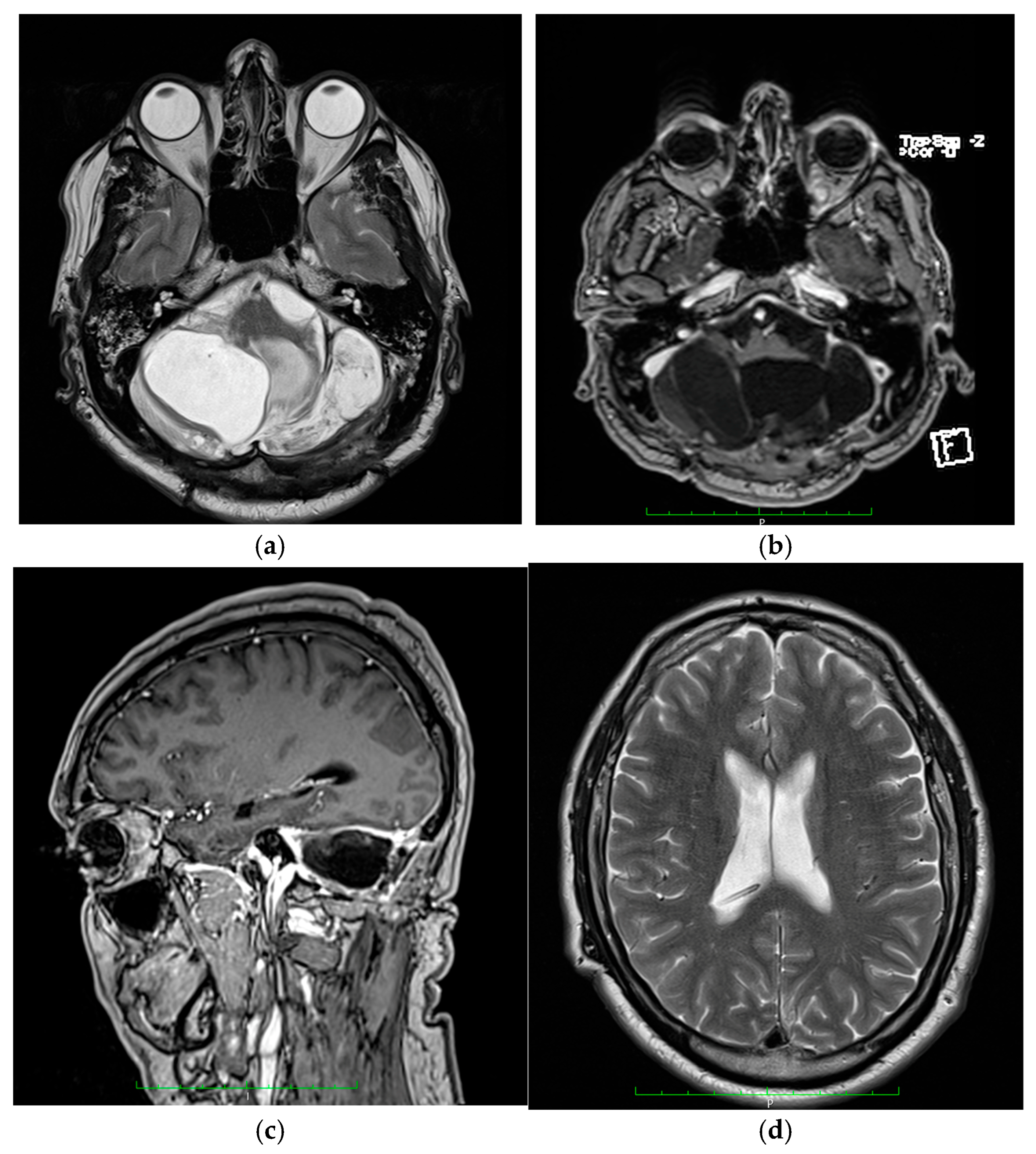 - Li, L.; Xie, H.M.; Richard, S.A.; Lan, Z. Hemangioblastoma masquerading as a ring enhancing lesion in the cerebellum: A case report. Medicine 2022, 101, e28665. [Google Scholar] [CrossRef]
