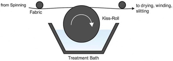Application of Postbiotic Formulations onto Nonwoven Topsheets: A schematic of the kiss-roll coating process for nonwoven fabrics is shown in Figure 1. In this process, an immersed roll picks up a liquid from a reservoir and transfers it to the fabric via controlled contact, allowing uniform application.