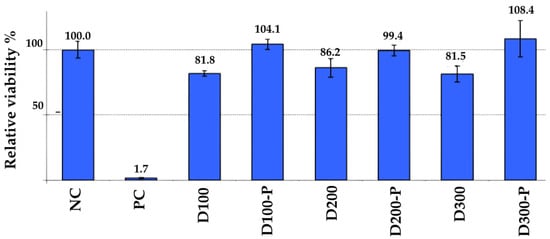 Relative viability of different groups. NC (Negative Control): This group is a reference that shows how healthy cells are in a non-toxic environment. Its value is set at 100.0%. This indicates that the cells have full viability under normal conditions. PC (Positive Control-SDS): This group shows how much cell viability decreases when a known cytotoxic (toxic to cells) substance is used. Its value is 1.7%. This proves that the test is working correctly and can reliably detect a cytotoxic effect. The samples with codes D100, D200, and D300 are materials that do not contain postbiotics, while samples with codes D100-P, D200-P, and D300-P contain postbiotics.