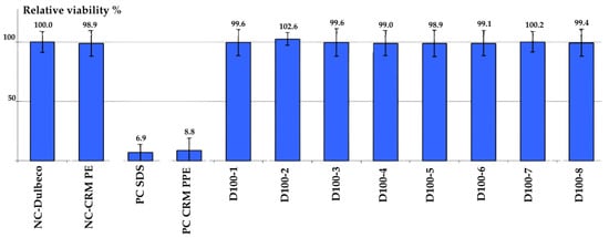 Human keratinocyte cell line (HEKA 500K, SN 34120) was cultured under standard conditions (37 ± 1 °C, 5 ± 0.5% CO2, 75 ± 5% RH). Cells were exposed to sample extracts or by direct contact for 72 h. The same extracts were consistently used throughout the study. Extracts were prepared by cutting the test materials into pieces corresponding to 3 cm2/mL, immersing them in DMEM cell culture medium supplemented with bovine serum, and incubating at 37 °C for 24 h in an orbital shaker incubator. After incubation, the mixtures were vortexed, and the liquid phase (extract) was collected for use in the experiments. For each well of the 24-well plate, 2 mL of extract was applied. A 10% (w/v) sodium dodecyl sulfate (SDS) solution was used as the positive control. Control samples were prepared in the same manner as the test samples: cut into 3 cm2/mL pieces, immersed in DMEM medium supplemented with bovine serum, incubated at 37 °C for 24 h in an orbital shaker incubator, vortexed, and the liquid phase was collected for use. All treatments were performed in triplicate [].
