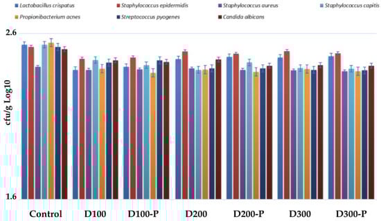 The balance between S. epidermidis and S. aureus was specifically monitored to assess skin microbiota–friendly effects, as described before []. Log10 CFU/mL values were used to calculate microbial diversity indices. Artificial skin microbiota—Skin microbiota simulated species applied on human epidermal keratinocytes: Lactobacillus crispatus ATA-LTC 240522, Staphylococcus epidermidis ATCC 12228, Staphylococcus aureus ATCC 6538, Staphylococcus capitis ATCC 35661, Cutibacterium acnes ATA-LPC 0204221, Streptococcus pyogenes ATA TCSP 210911, and Candida albicans ATCC 10231 [,].