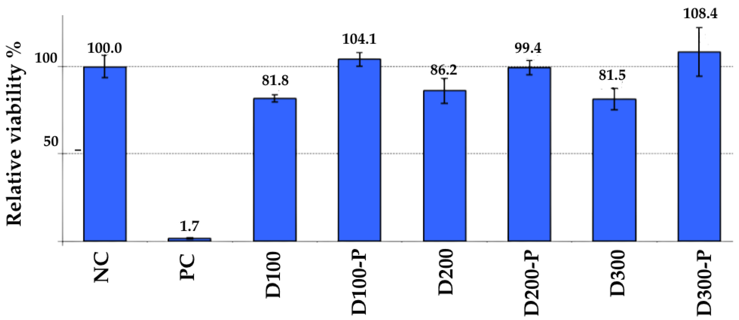 3.3. In Vitro Cytotoxicity and Tissue Viability