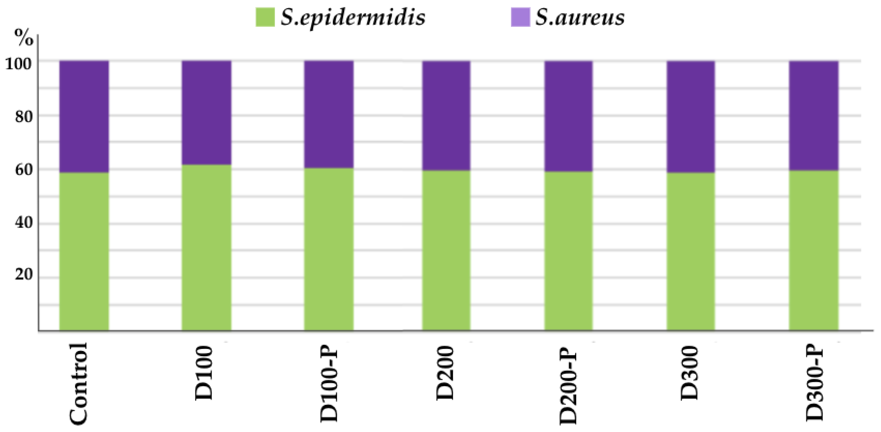 - D’Arcangelo, S.; Fermo, P.D.; Diban, F.; Ferrone, V.; D’Ercole, S.; Giulio, M.D.; Lodovico, S.D. Staphylococcus Aureus/Staphylococcus Epidermidis from Skin Microbiota Are Balanced by Pomegranate Peel Extract: An Eco-Sustainable Approach. PLoS ONE 2024, 19, e0308211. [Google Scholar] [CrossRef]