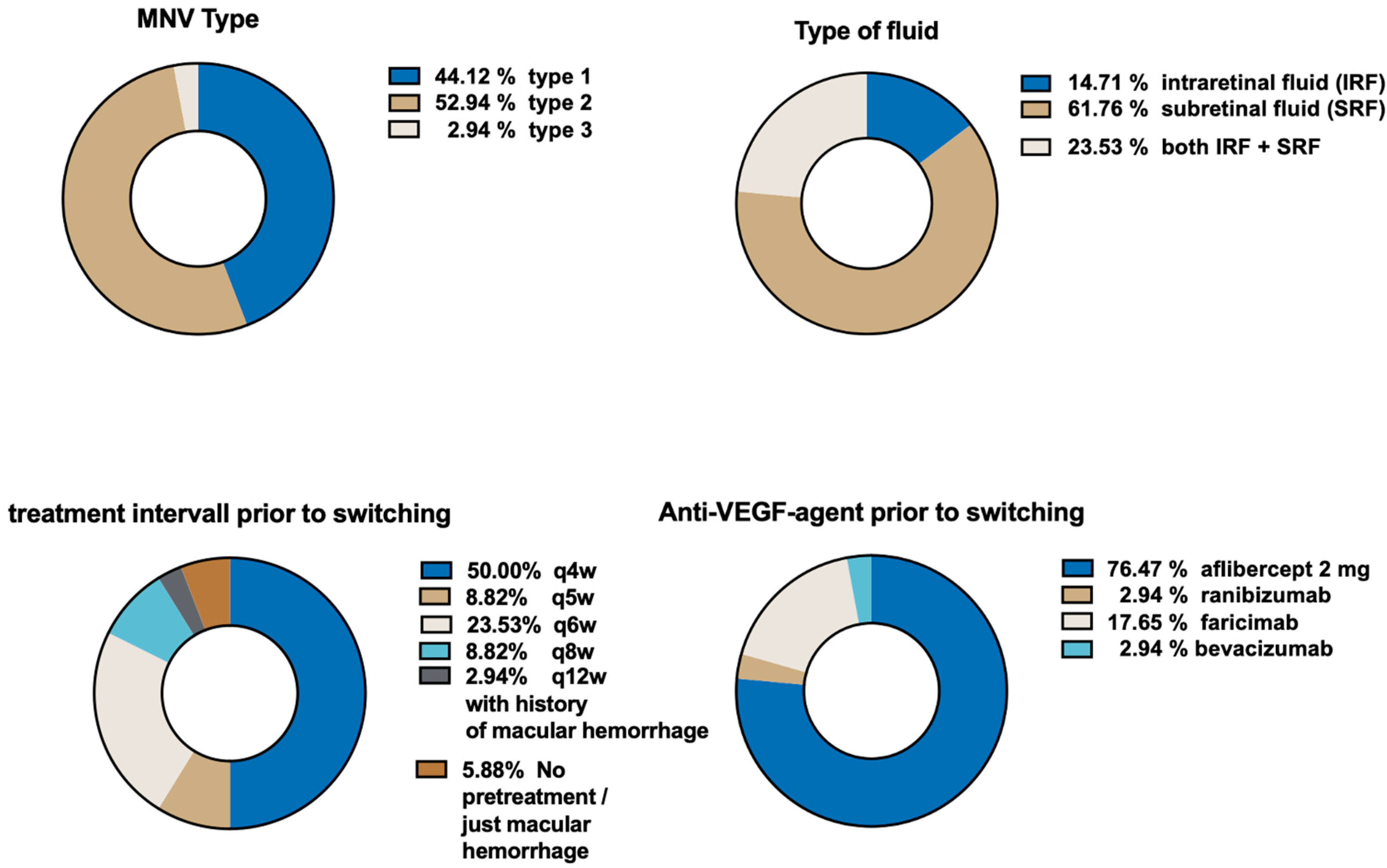 - Eckardt, F.; Lorger, A.; Hafner, M.; Klaas, J.E.; Schworm, B.; Kreutzer, T.C.; Priglinger, S.G.; Siedlecki, J. Retinal and choroidal efficacy of switching treatment to faricimab in recalcitrant neovascular age related macular degeneration. Sci. Rep. 2024, 14, 9600. [Google Scholar] [CrossRef] [PubMed]