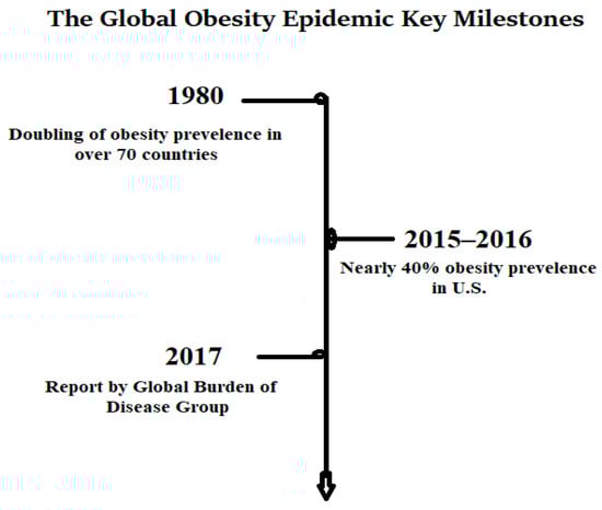 Obesity is a highly prevalent, multifactorial, and biologically complex disease characterized by deregulated energy balance, adipose tissue dysfunction, and impaired metabolic homeostasis. Interconnected genomic, epigenomic, nutrigenomic, environmental, and behavioral determinants shape it []. Recent global estimates indicate that over 2.5 billion adults worldwide are overweight or obese, and obesity prevalence has nearly tripled since 1990, according to the Global Burden of Disease Report []. In the United States, the National Health and Nutrition Examination (NHANES) reports an alarming 42.4% adult obesity prevalence, with 9.2% of adults meeting criteria for class III obesity (BMI ≥ 40 kg/m2) []. Middle Eastern, Australian, and Asian regions have also shown a two- to threefold surge in obesity incidence over the last two decades, primarily due to rapid urbanization, ultra-processed dietary patterns, and sedentary lifestyles []. While obesity is commonly defined by a BMI ≥ 30 kg/m2, reliance on BMI alone underestimates visceral adiposity-driven cardiometabolic risks. Recent advances in genome-wide association studies (GWAS), functional epigenomics, microbiome profiling, and nutrigenomic modeling have revolutionized our understanding of energy homeostasis, fat distribution, and metabolic programming [].