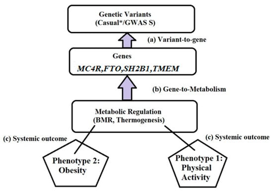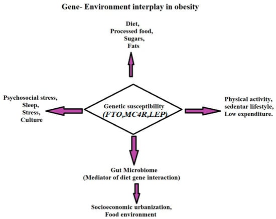 The genetic composition that governs energy balance, lifestyle, and perinatally imprinted behavior is responsible for excessive fat storage and obesity. In this regard, environmental factors (such as unhealthy eating and exercise habits), fetal programming, and even assortative mating may contribute to the obesity pandemic by creating a genetic predisposition. Adverse maternal nutrition and perinatal environmental exposures induce epigenetic reprogramming during fetal development, increasing lifelong obesity susceptibility []. Living a physically active lifestyle is linked to a 40% decrease in the genetic predisposition to common Obesity, according to a prospective study conducted on 20,000 men and women from EPIC-NORFLOK to determine the extent to which genetic susceptibility may be attenuated by such a lifestyle []. Estimates of heritability for obesity range from 40% to 70%, indicating a significant genetic component.