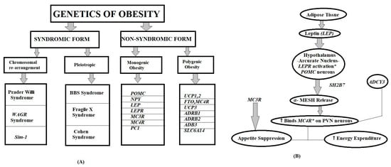 Figure 3A illustrates the classification of genetic forms of obesity, categorized into syndromic and non-syndromic types. Syndromic obesity includes chromosomal rearrangement–related and pleiotropic disorders such as Prader–Willi syndrome, Bardet–Biedl syndrome, and Cohen syndrome. Non-syndromic obesity is further subdivided into monogenic and polygenic forms. Genes implicated in monogenic obesity include POMC, LEP, LEPR, MC3R, and MC4R, while polygenic obesity involves variants in genes such as FTO, UCP1-3, MC4R, ADRB1-3, and SLC6A14. Figure 3B Schematic representation of the leptin–melanocortin signaling pathway.