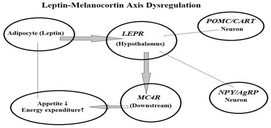 Genetic and Molecular Factors in Obesity: Leptin–Melanocortin Axis Dysregulation: Schematic representation of the leptin–melanocortin signaling pathway and its dysregulation in obesity. Leptin, secreted from adipocytes, binds to leptin receptors (LEPR) in the hypothalamus. This interaction activates pro-opiomelanocortin (POMC) and cocaine- and amphetamine-regulated transcript (CART) neurons, while simultaneously inhibiting neuropeptide Y (NPY) and agouti-related peptide (AgRP) neurons. The cascade subsequently activates the downstream melanocortin-4 receptor (MC4R), leading to reduced appetite (↓) and increased energy expenditure (↑).