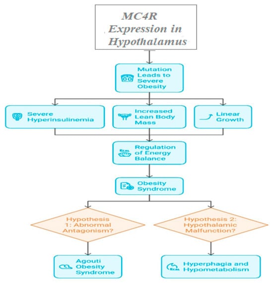 A mutation that truncates the receptor before the transmembrane domain was found to be homozygous in affected individuals. Despite having a normal birth weight, leptin receptor-deficient individuals gained weight quickly in the first few months of life, displaying significant hyperphagia and hostile behavior when food was refused []. Food intake and energy balance are significantly impacted by MC4R, which is also expressed in the hypothalamus []. Severe Obesity, severe hyperinsulinemia, increased lean body mass, and linear growth of the five known melanocortin receptors are clinical characteristics of mutant carriers; MC4R has been most closely associated with regulating energy balance in rats [,]. A unique role for the MC4-R in the control of energy balance is defined by the obesity syndrome that results from its absence, which is very similar to the Agouti disease. This suggests that the underlying cause of the agouti obesity syndrome is abnormal antagonism of the MC4-R. An alternate explanation for the finding that MC4-R signaling directly affects food and metabolism is that deletion of the MC4-R gene may cause a malfunction in the development of the hypothalamus, which would lead to hyperphagia and hypometabolism. For instance, Obesity is linked to abnormalities in the ventromedial hypothalamus’s function in humans and rats []. MC4R mutant individuals exhibit higher lean mass and increased fat mass, which is not observed in leptin insufficiency.