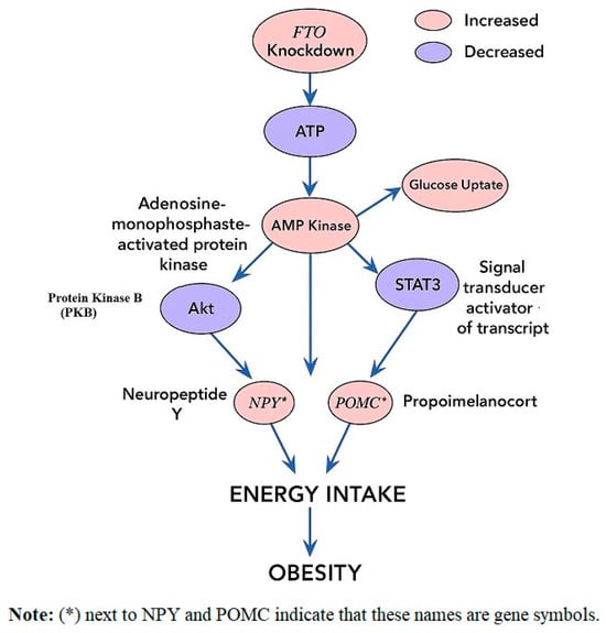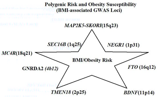 Unless explicitly stated otherwise, all figures and tables in this section refer to human genetic association data (e.g., polymorphisms) rather than experimental knockdown models. Obesity is increasingly recognized as a neuroendocrine-driven condition, arising from complex gene–environment interactions. Recent large-scale molecular studies demonstrate that most obesity risk arises from the cumulative effects of numerous common variants [].