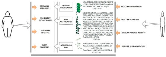 Epigenetic regulation of genes related to Obesity. An illustration of the most prevalent epigenetic modifications and targeted genes researched in the context of obesogenic versus healthy lifestyle choices.