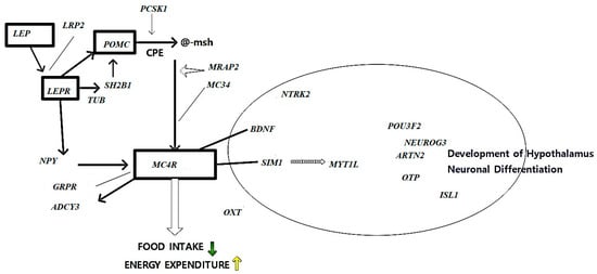 A complicated condition, Obesity is influenced by several hereditary and environmental variables. It has also recently been proposed that uncommon genetic variations with potent effects may be the cause of Obesity. Monogenic Obesity is linked to gene mutations related to the hypothalamic leptin-melanocortin signaling pathway. LEP, LEPR, POMC, PCSK1, MC4R, MC3R, SH2B1, NTRK2, MRAP2, and TUB are some of these genes. New genes linked to Obesity, as shown in Table 2, that are involved in the melanocortin pathway or hypothalamic development have recently been discovered. These genes include ADCY3, MYT1L, POU3F2, GRPR, and LRP2 [].
