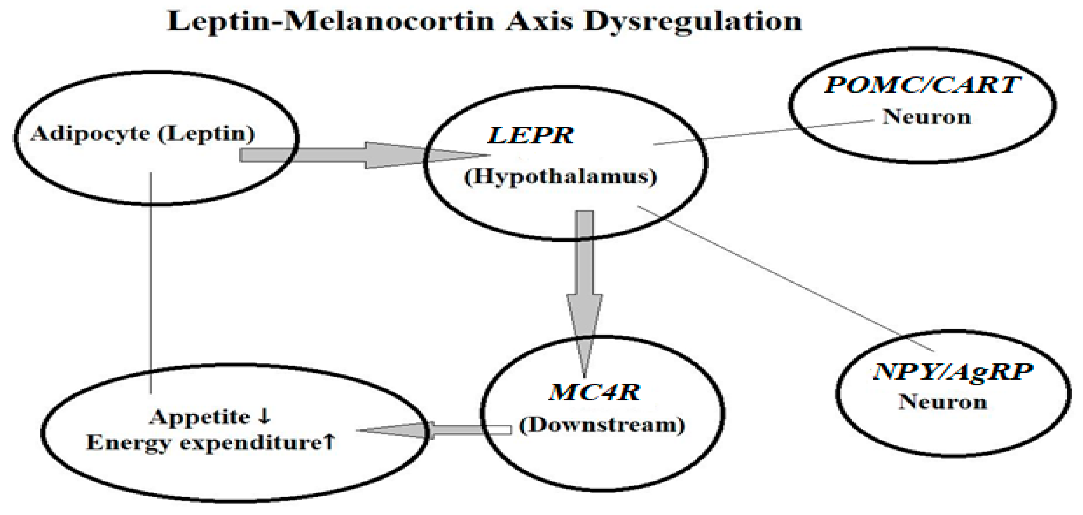 | LEPR | Leptin receptor | Mediates leptin signaling | Impaired satiety, early-onset obesity | [15] |