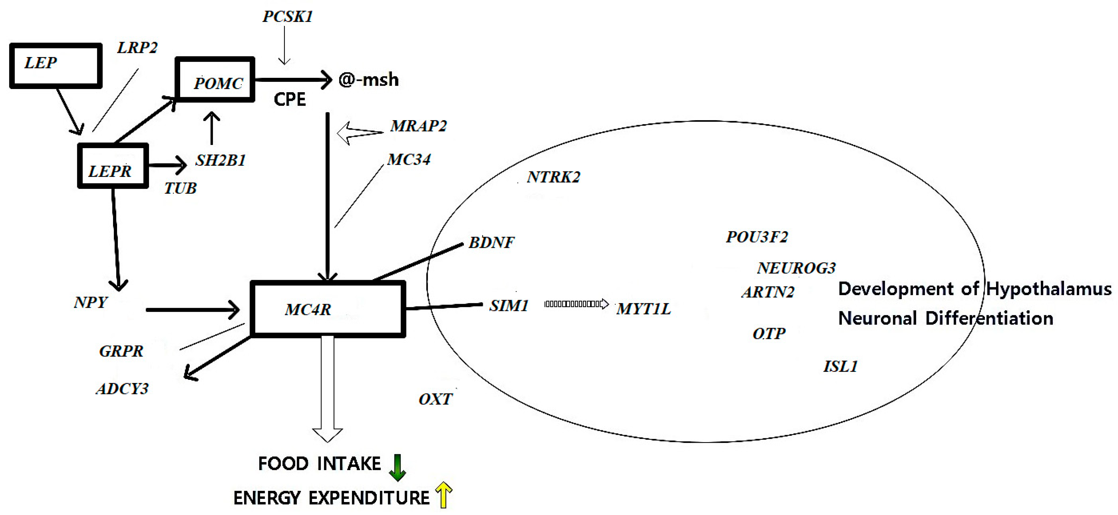 | POMC | Pro-opiomelanocortin | Precursor for α-MSH, binds MC4R | Mutations cause extreme hyperphagia & adrenal dysfunction | [17] |