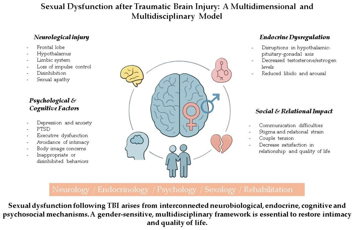 2]. The manifestations of SD after TBI are diverse, encompassing decreased libido, erectile dysfunction, impaired arousal, difficulties with orgasm and, in some cases, inappropriate sexual behaviors (ISB). Importantly, these disturbances affect both men and women and they arise from the intricate interplay among neurological, endocrine, cognitive, psychological and social domains [