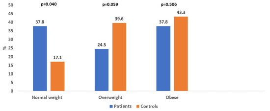 Distribution of normal weight, overweight, and obese patients and controls.