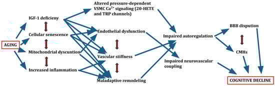 Chronic low-grade inflammation, or “inflammaging”, represents a systemic manifestation of altered intercellular communication, another hallmark of aging. In the cerebral vasculature, this persistent inflammatory state further destabilizes autoregulatory mechanisms by promoting endothelial activation, vascular stiffness, and maladaptive remodeling [67,68]. In addition to the cell-intrinsic mechanisms outlined above, cell non-autonomous processes play a fundamental role in the age-related decline of cerebrovascular function. One of the most extensively studied systemic factors contributing to vascular aging is the progressive decline in circulating levels of insulin-like growth factor-1 (IGF-1) [69]. IGF-1 is a key mediator of vascular maintenance and repair, exerting pleiotropic protective effects on endothelial and smooth muscle cells [69]. The age-associated reduction in IGF-1 production, primarily due to diminished growth hormone (GH) signaling and hepatic output, represents a hallmark of disrupted intercellular communication—a core pillar of the aging process. Experimental studies in mouse models have provided compelling evidence for the critical role of IGF-1 in maintaining cerebrovascular health [69,70,71]. Mice with reduced circulating IGF-1 levels exhibit impaired cerebral autoregulation, characterized by diminished myogenic responses and blunted vascular reactivity to pressure fluctuations. Specifically, the autoregulatory range in IGF-1 deficient mice was narrower (80–140 mmHg) compared to controls (80–170 mmHg), indicating reduced capacity to maintain stable cerebral blood flow across a range of pressures. Although transfer-function gain and phase values were not directly reported, pressure-diameter relationships showed significantly impaired myogenic tone development in IGF-1 deficient hypertensive mice, reflecting marked autoregulatory dysfunction [71]. This impairment compromises the brain’s ability to buffer systemic blood pressure changes, increasing susceptibility to hypoperfusion and microvascular damage. Importantly, the adaptive response to chronic hypertension is also disrupted in the setting of IGF-1 deficiency, as vascular remodeling and functional adjustments required to maintain CBF at elevated perfusion pressures are impaired [71]. The inability to mount an effective hypertensive adaptation exacerbates cerebrovascular vulnerability in aged individuals with comorbid hypertension, a common clinical scenario. IGF-1 deficiency also contributes to endothelial dysfunction, heightened oxidative stress, and increased vascular inflammation [72]. These alterations mirror the endothelial changes observed in aged individuals and synergize with other hallmarks of aging, such as mitochondrial dysfunction and cellular senescence [56,65], to destabilize cerebrovascular homeostasis. In line with these mechanisms, animal studies have shown that IGF-1 deficiency exacerbates BBB disruption [73], a key pathological feature contributing to increased vascular permeability, neuroinflammation, and neuronal injury. Moreover, reduced IGF-1 signaling has been linked to a higher burden of CMHs, further highlighting the role of systemic growth factor deficiency in promoting microvascular fragility and structural damage in aging [74,75]. Findings obtained in heterochronic parabiosis models further emphasize that age-related cerebrovascular dysregulation cannot be fully understood without considering the contribution of cell non-autonomous mechanisms [76], particularly the decline in circulating IGF-1 [77]. Restoring systemic trophic support represents a promising avenue for preserving CBF regulation, protecting microvascular integrity, and mitigating the progression of cerebrovascular pathology in the aging brain.