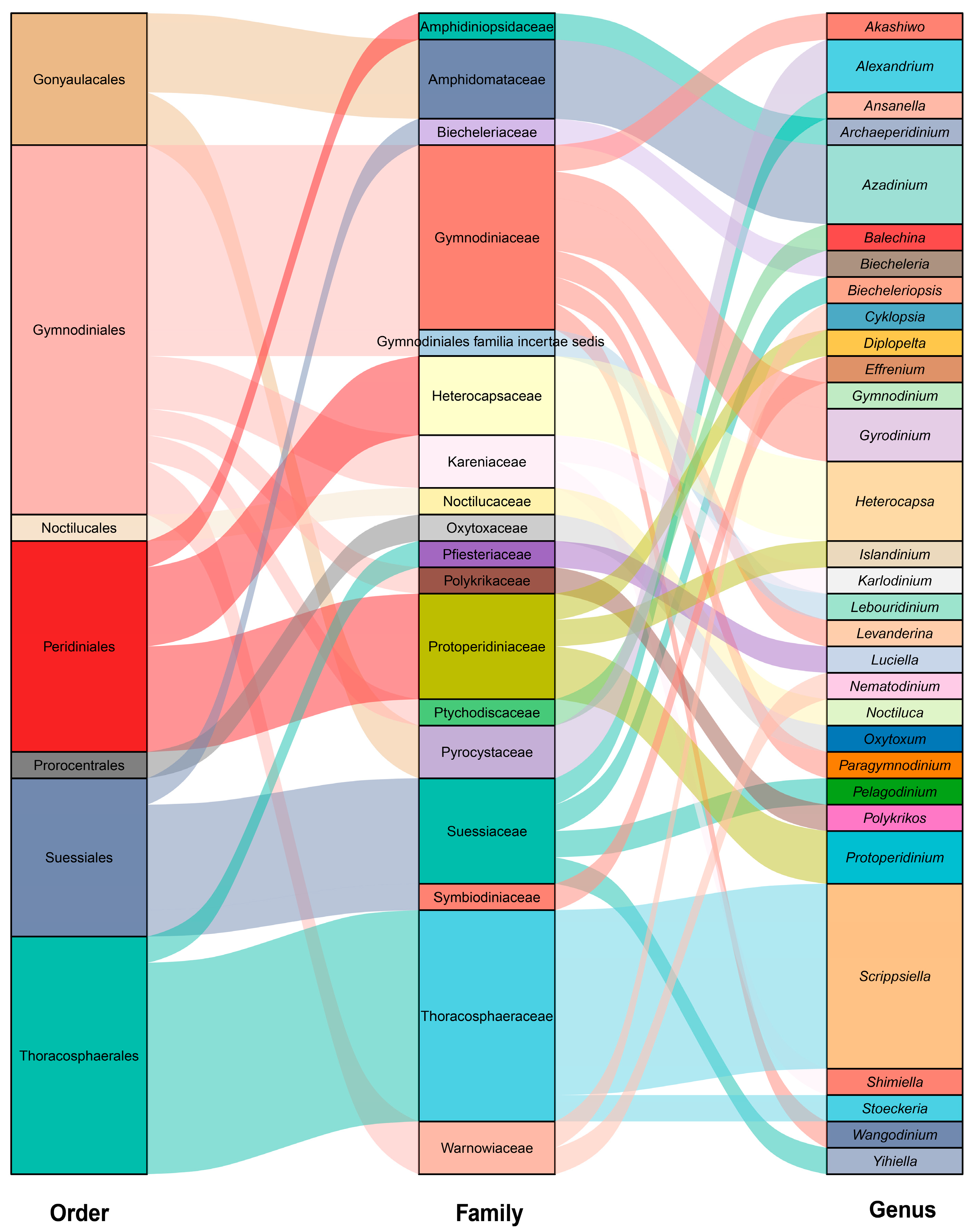 - Gomez, F.; Artigas, L.F.; Gast, R.J. Molecular phylogeny and synonymy of Balechina gracilis comb. nov. (=Gymnodinium gracile), a widespread polymorphic unarmored dinoflagellate (Dinophyceae). J. Phycol. 2021, 57, 694–697. [Google Scholar] [CrossRef]