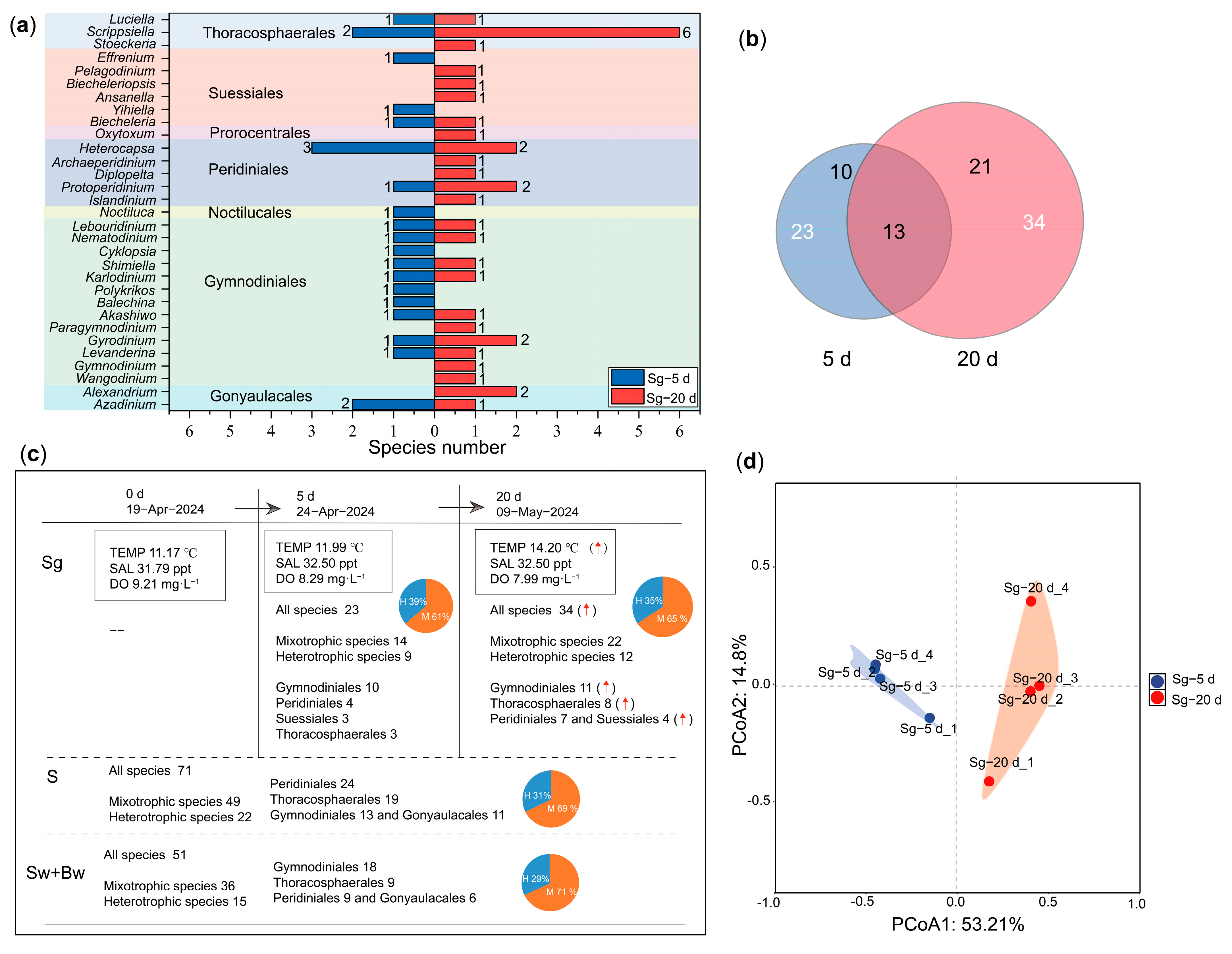 4.3. Species Diversity of In Situ Germinated Dinoflagellate Cysts with Germination Duration Extended