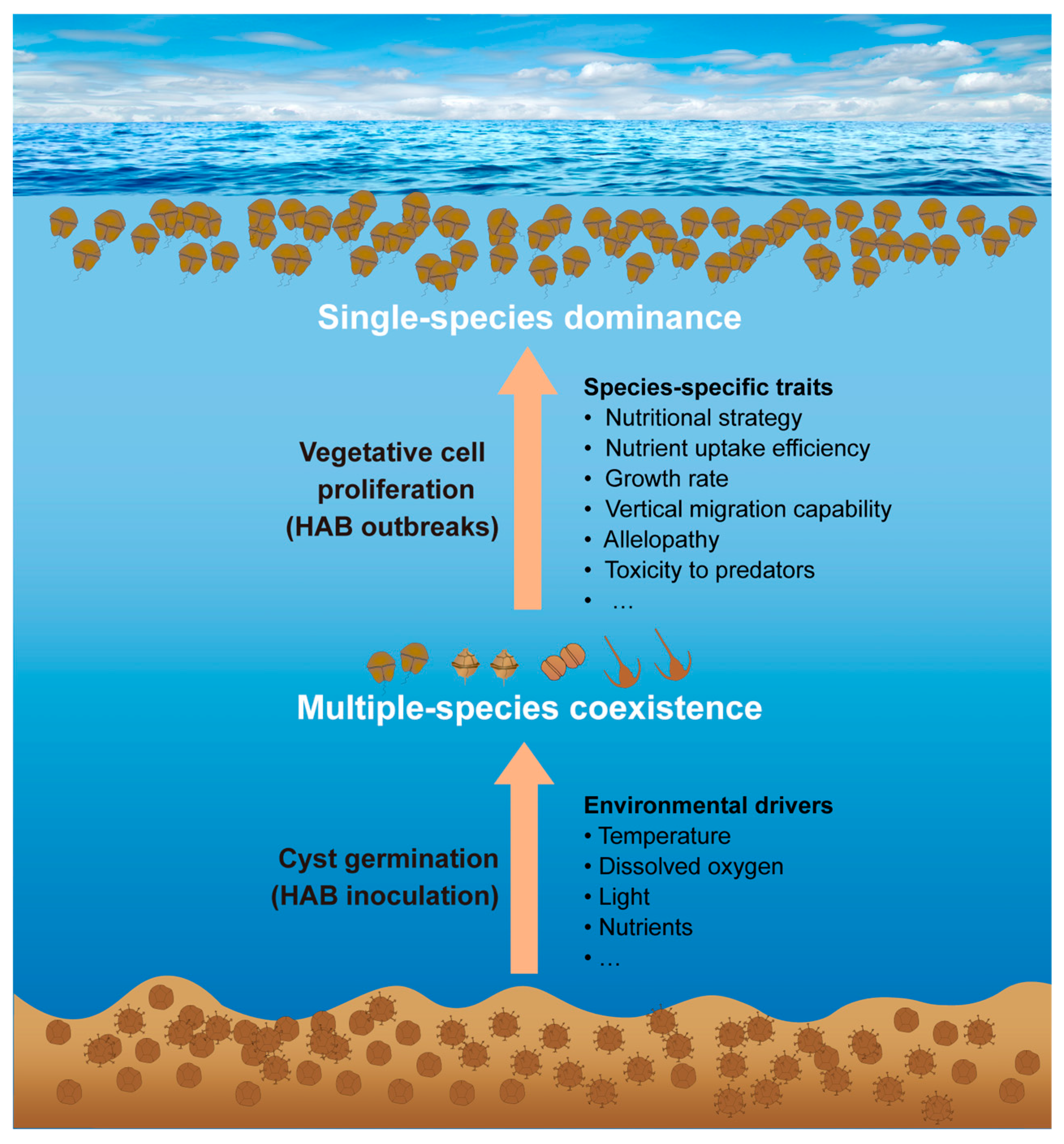 - Tang, Y.; Hu, Z.; Deng, Y. Characteristical life history (resting cyst) provides a mechanism for recurrence and geographic expansion of harmful algal blooms of dinoflagellates: A Review. Stud. Mar. Sin. 2016, 51, 132–154. [Google Scholar]