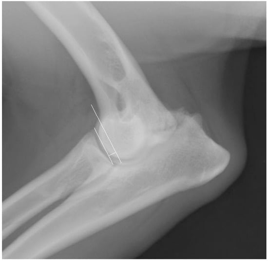 Based on the obtained radiographs, incongruence was assessed in the mediolateral extension and craniocaudal views according to the criteria proposed by Wind (1986) [19]. The radioulnar “step,” the shape of the trochlear notch of the ulna, the width of the humeroulnar joint space, and the displacement of the humeral condyle were analyzed. The radioulnar “step” was calculated according to the method of Brunnberg et al. [20], which involves marking two lines on the radiograph: the first along the articular surface of the radial head (the so-called radial plateau), and a second parallel line intersecting the tip of the lateral coronoid process (Figure 1). The distance between these lines constituted the radioulnar “step,” which was measured in mm.