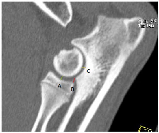 Multiplanar reconstruction computed tomography (CT) image in the sagittal plane. The measurement definitions are shown: width of the humeroradial joint space (A), height of the radioulnar “step” (B), and width of the humeroulnar joint space (C).