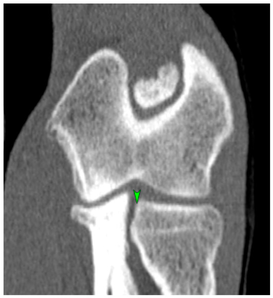Each CT image of the elbow joint was analyzed using multiplanar reconstructions in sagittal, dorsal, and transverse sections. The incongruity measurement was performed according to the method proposed by Samoy et al. [18] modified by the authors of this study, which involved measuring the joint space width from the multiplanar reconstruction (MPR) in the sagittal section (Figure 2) and determining the height of the radioulnar “step” in the dorsal section (Figure 3). The joint space width of the humeroulnar joint was measured between the most concave point of the trochlear notch of the ulna and the closest point on the humeral condyle. The joint space width of the humeroradial joint was measured between the most concave point of the radial bone head and the closest point on the humeral condyle. The height of the radioulnar “step” was determined between the most distal point of the trochlear notch of the ulna and the most proximal point of the caudal aspect of the radial head. Additionally, the radioulnar “step” was measured between the axial aspect of the medial coronoid process and the axial aspect of the radial head from the multiplanar view reconstruction in the dorsal section.