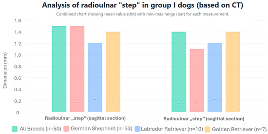 In measurements performed on MPR images, in accordance with the method of Samoy et al. [18] modified by the authors of this study, the mean height of the radioulnar “step” was 0.177 ± 0.33 mm (range: 0–1.5 mm) in the sagittal section; meanwhile, in the dorsal section, it was 0.152 ± 0.312 mm (range: 0–1.4 mm). The values of the radioulnar “step” for individual breeds are presented in Figure 4 and Table 1. No statistically significant differences were found in the mean height of the radioulnar “step” in either of the sections (sagittal p = 0.810 and dorsal p = 0.498) between the studied breeds.