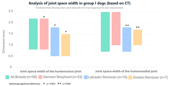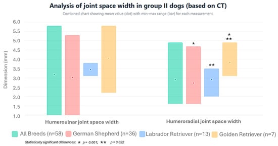 The mean joint space width of the humeroulnar joint, measured on MPR images in the sagittal section according to the method of Samoya et al. [18] modified by the authors, was 1.34 ± 0.34 mm (range: 0.8–2.2 mm). For the humeroradial joint, this value was 1.43 ± 0.31 mm (range: 0.7–2.5 mm). The mean joint space width values of the humeroulnar and humeroradial joints for individual breeds are presented in Figure 5 and Table 1. Statistically significant differences were observed in the mean joint space width of the humeroulnar joint between Golden Retrievers and German Shepherds (p < 0.001). However, no statistically significant difference was found between Labrador Retrievers and German Shepherds (p = 0.070) or Labrador Retrievers and Golden Retrievers (p = 0.055). For the humeroradial joint, statistically significant differences were found between Labrador Retrievers and German Shepherds (p = 0.002). However, no statistically significant difference was found between Labrador Retrievers and Golden Retrievers (p = 0.350) or Golden Retrievers and German Shepherds (p = 0.091).