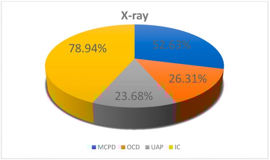 Primary causes of elbow dysplasia may occur alone or in combination [3,5]. In our studies, combinations of primary causes of elbow dysplasia were more common on X-ray and computed tomography (X-ray, 63.16%; CT, 76.93%), compared with primary causes of elbow dysplasia occurring alone (X-ray, 36.84%; CT, 23.07%). In the case of primary causes of elbow dysplasia occurring alone, incongruity was the most common in the X-ray examination (64.3% of cases), while other primary causes of elbow dysplasia were significantly less common (MCPD, 7.11%; UAP, 7.14%; OCD, 21.42% of cases). However, in the CT examination, the most common single primary causes of ED were MCPD (41.66% of cases) and IC (31.35% of cases), while OCD and UAP occurring alone were diagnosed significantly less frequently. Considering the frequency of combinations of primary causes of elbow dysplasia, both the X-ray and CT examinations revealed the combination of MCPD and IC as most frequently diagnosed (X-ray, 45.86%; CT, 55% of cases). The difference in the incidence of combinations of MCPD and IC between X-ray and CT scans—similarly to the frequency of primary causes of ED occurring alone—results from the superior diagnostic utility of CT scans in diagnosing medial coronoid process disease and incongruity. These observations are in line with Remy et al. [30] who reported that, in the case of singular primary causes of ED, MCPD, and IC were the most frequently diagnosed; meanwhile, in the case of combinations of these causes, the combination of MCPD with IC was the most common.