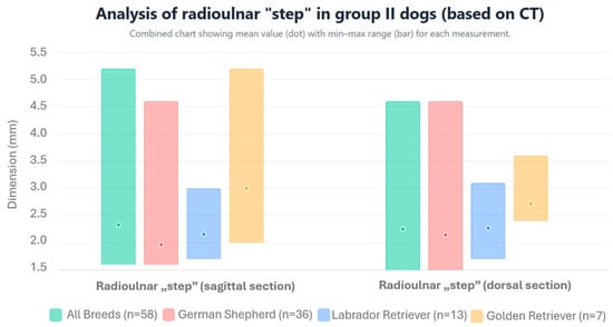 Statistical analysis revealed significant differences in the mean height of the radioulnar “step” between the dogs from group II with diagnosed incongruity and the dogs from group I (p < 0.001), the dogs from group II with diagnosed incongruity and the dogs from group II without incongruity (p < 0.001), and the dogs from group I and the dogs from group II without incongruity (p = 0.015).