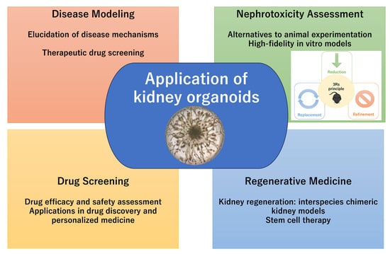 - Nishinakamura, R. Advances and challenges toward developing kidney organoids for clinical applications. Cell Stem Cell 2023, 30, 1017–1027. [Google Scholar] [CrossRef]
