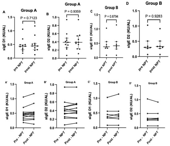 In Group A, a higher level of sIgE to Dermatophagoides pteronyssinus was noted post-NPT compared to the pre-NPT assessment (Figure 1A), while for sIgE to Dermatophagoides farinae, the levels were similar (Figure 1B). In Group B, the sIgE levels to both allergens, Dermatophagoides pteronyssinus and Dermatophagoides farinae, were higher post-NPT compared to pre-NPT assessment (Figure 1C,D). Individual changes in sIgE to Dermatophagoides pteronyssinus and Dermatophagoides farinae before and after provocation in both Groups A and B are demonstrated in Figure 1A’–D’. Median levels of sIgE to both allergens in Groups A and B are presented in Table 4.