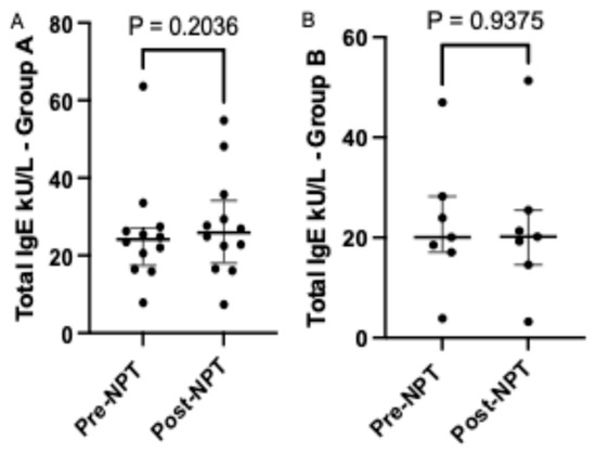 A higher median level of total IgE was noted in nasal lavage from Group A subjects (Figure 2A) after NPT (25.89; [18.06–34.14]) compared to pre-NPT (24.16; [17.45–27.14]). A lower increase in total IgE levels was noted in nasal lavage secretions acquired from Group B (Figure 2B) subjects (20.20; [14.56–25.48]) post-NPT compared to (20.07; [17.09–28.22]) pre-NPT.