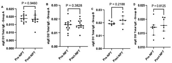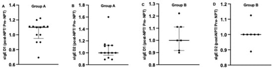 After comparing the individual relative change (sIgE post-NPT/sIgE pre-NPT) (Figure 4), we found the following results: In Group A, a higher median relative change for sIgE to Dermatophagoides pteronyssinus (1.1; [0.95–1.111]) was noted post-NPT compared to sIgE to Dermatophagoides farinae (1; 90.9583–1.1250]. Furthermore, eight subjects showed a fold change higher than 1.1 for sIgE to Dermatophagoides pteronyssinus. For Dermatophagoides farinae, five subjects showed a fold change of 1.1 or higher, with 1 subject having a fold change of 1.6.