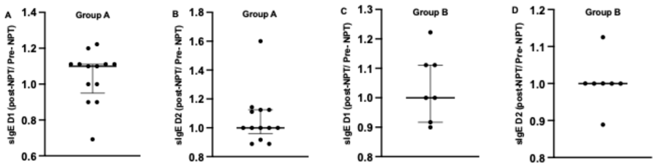 - For sIgE to Dermatophagoides pteronyssinus (D1): 50.5% (Group A, pre-NPT); 56.6% (Group A, post-NPT); 64.8% (Group B, pre-NPT); 69.5% (Group B, post-NPT)