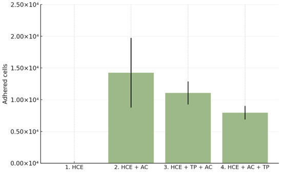 When CORNEIAL MED was applied simultaneously with A. castellanii, the mean number of adherent trophozoites recovered from HCE surfaces was 11,062 ± 1819 cells/insert (95% CI 8169–13,956), compared with 14,250 ± 5489 cells/insert (95% CI 5516–22,984) in the positive control (HCE + AC). This corresponded to a 32.95 ± 11.02% mean reduction in adhesion relative to the positive control (reported p = 0.0524; Table 1). The trend indicates measurable inhibition in the prophylaxis-mimicking setting.