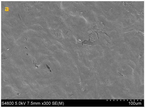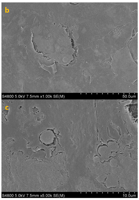 SEM image of HCE surface at 300× (a), 1000× (b) and 5000× (c) magnification.