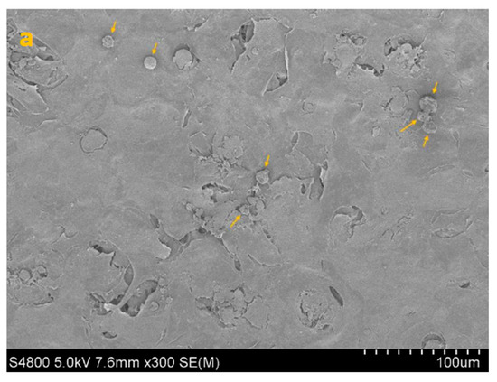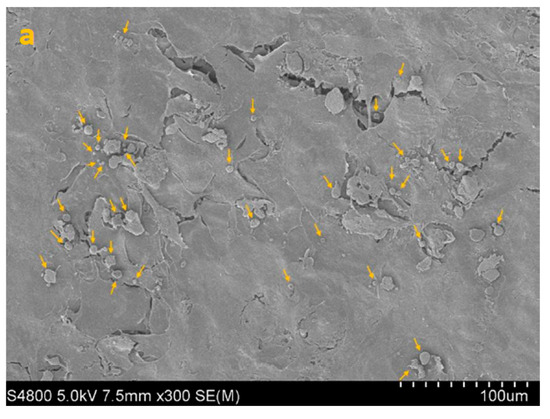 When CORNEIAL MED was applied 3 h after inoculation (post-adhesion paradigm), the mean number of adherent cells decreased to 7938 ± 1068 cells/insert (95% CI 6238–9637) versus 14,250 ± 5489 in the positive control, corresponding to a 51.89 ± 6.47% mean reduction in adhesion (reported p = 0.0073; Table 1). Quantitative SEM analysis further supported a marked decrease in surface colonization (Figure 2).
