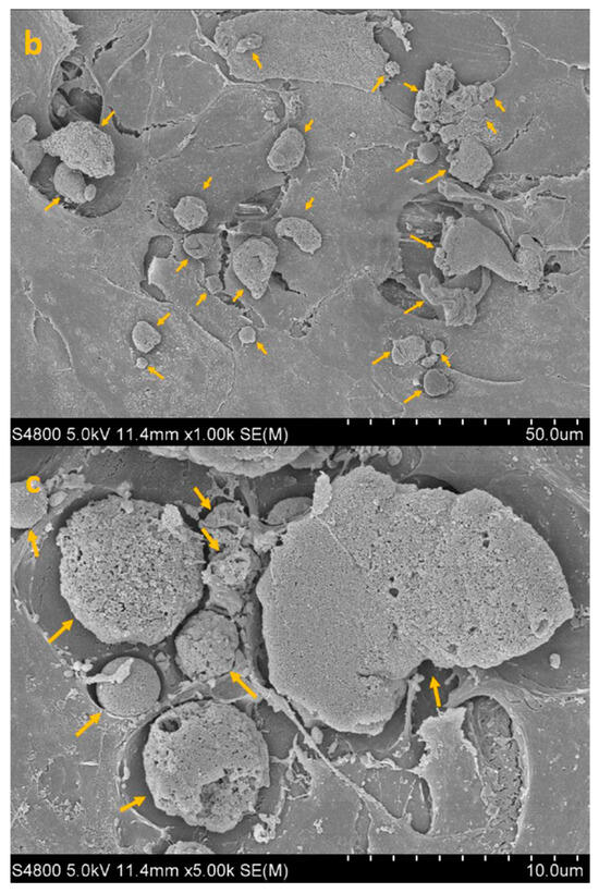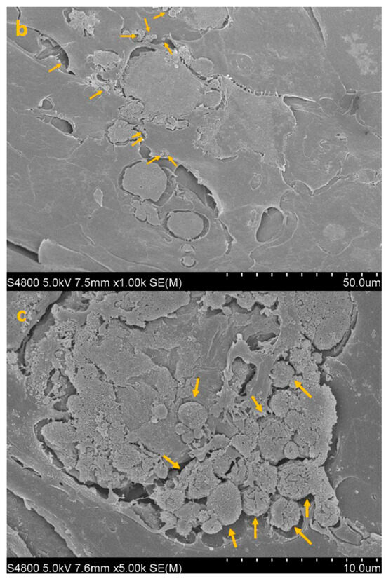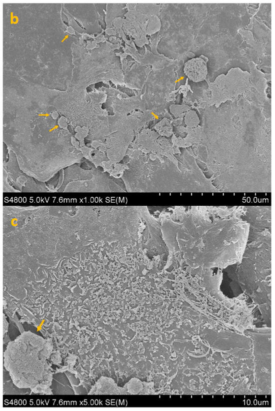 SEM image of HCE + AC at 300× (a), 1000× (b) and 5000× (c) magnification. Yellow arrows highlight densely adherent Acanthamoeba trophozoites forming the early adhesion layer.